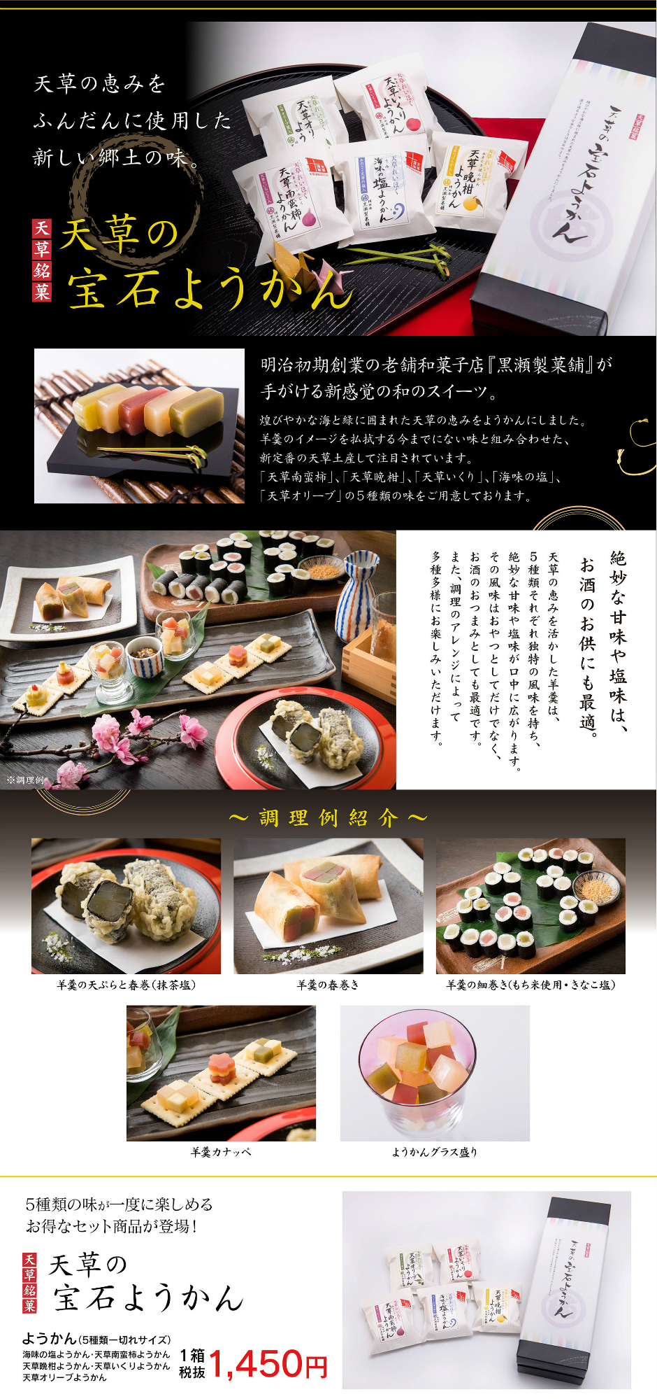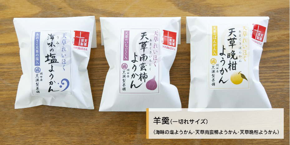 他にも天草ならではの自然の恵をうけた「天草南蛮柿」と「天草晩柑」で作った羊羹も大好評です。